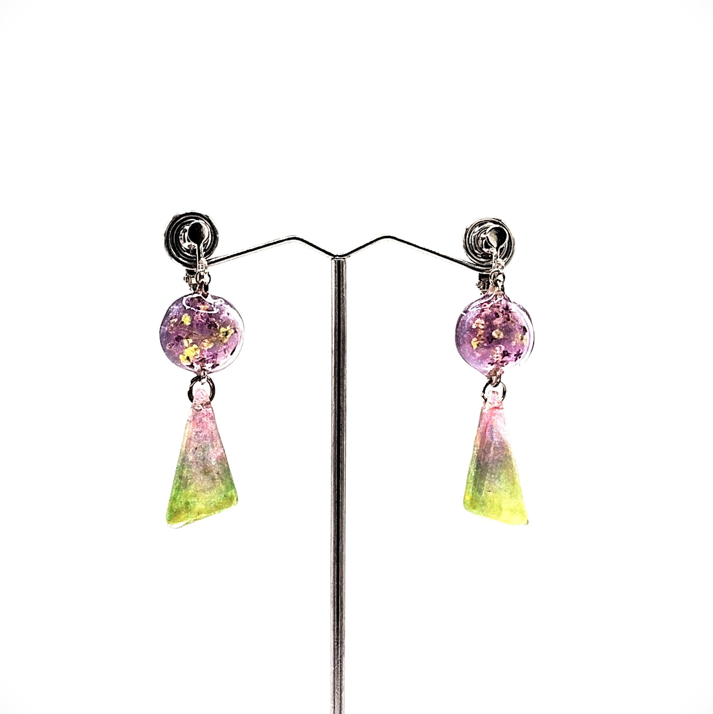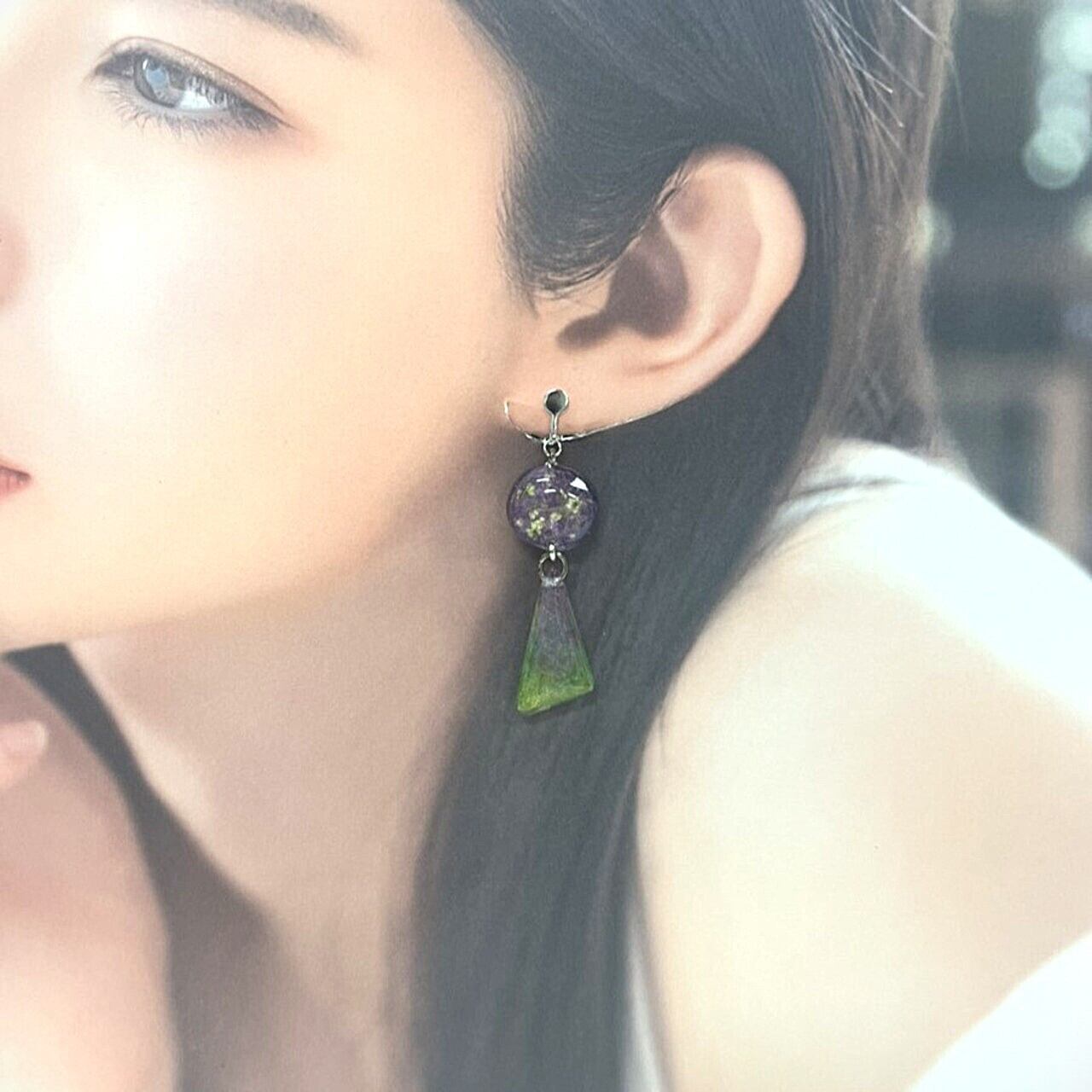 ラベンダーとグリーンの優しいグラデーションが光を受けてきらめき、耳元を上品に彩ります♪