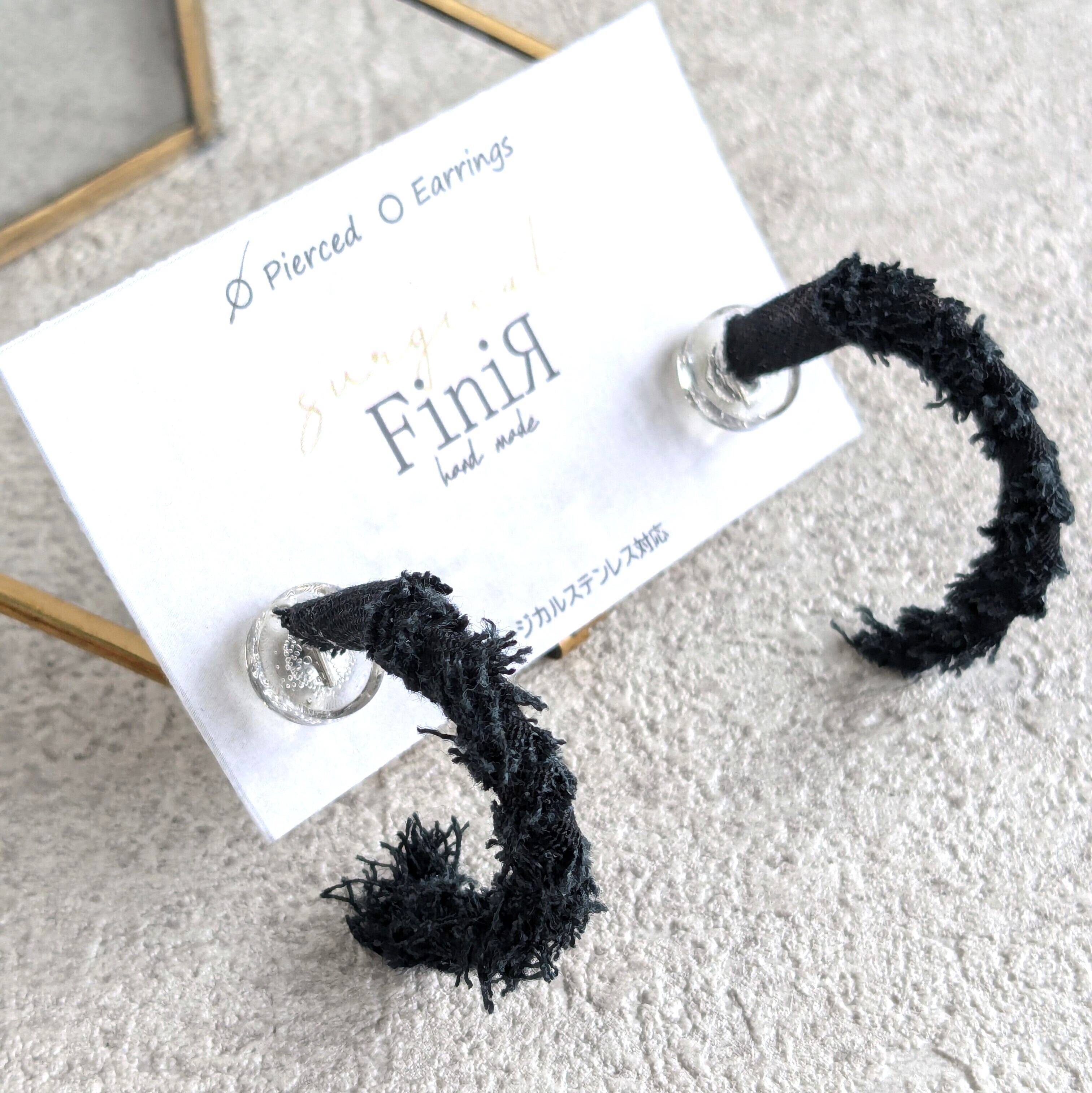 深みのあるブラックデニムを丁寧に巻き付け、フリンジの質感を活かして仕上げたC型ピアス。