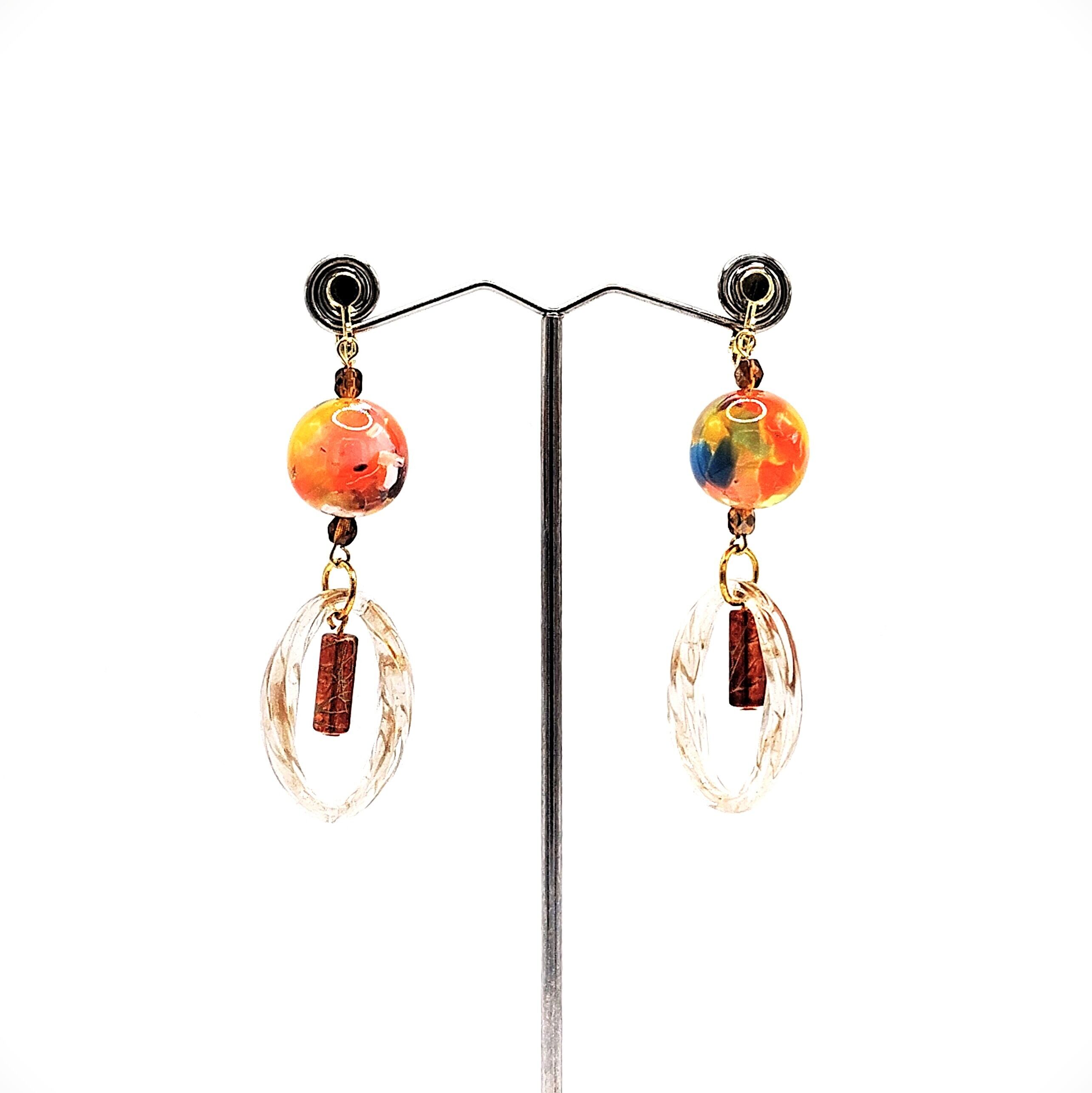 オレンジやブルーが溶け合うレジンビーズに、クリアなオーバルパーツを合わせた軽やかなデザイン✨