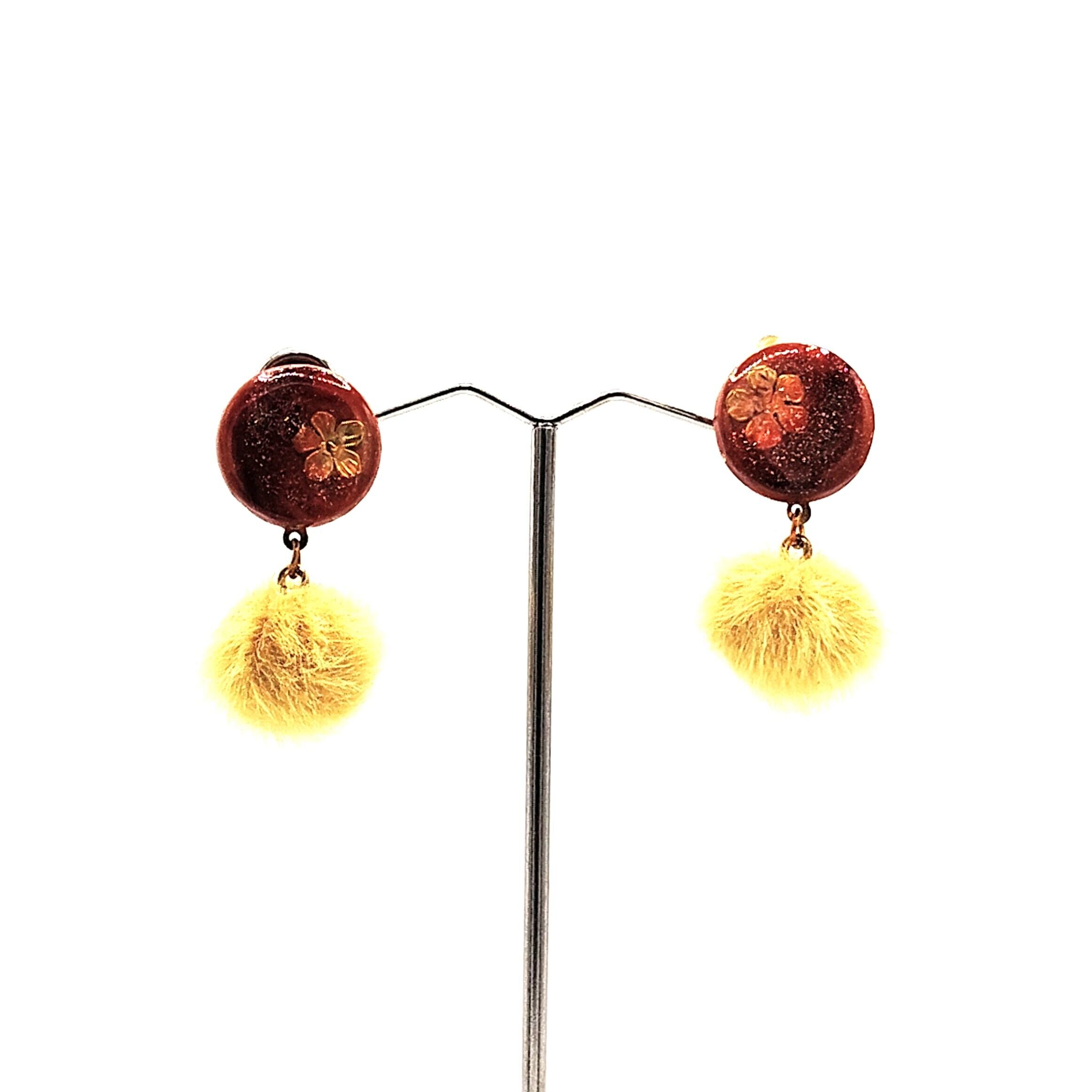 深みのあるオレンジレッドのレジンに小花を閉じ込め、温かみのあるファーボールを合わせた秋冬らしい仕様です。