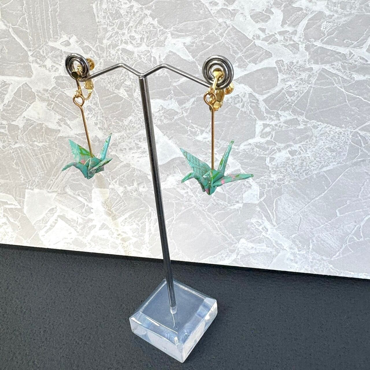 淡い翡翠色に手染めの友禅和紙を添えた、繊細な折鶴のイヤリング。