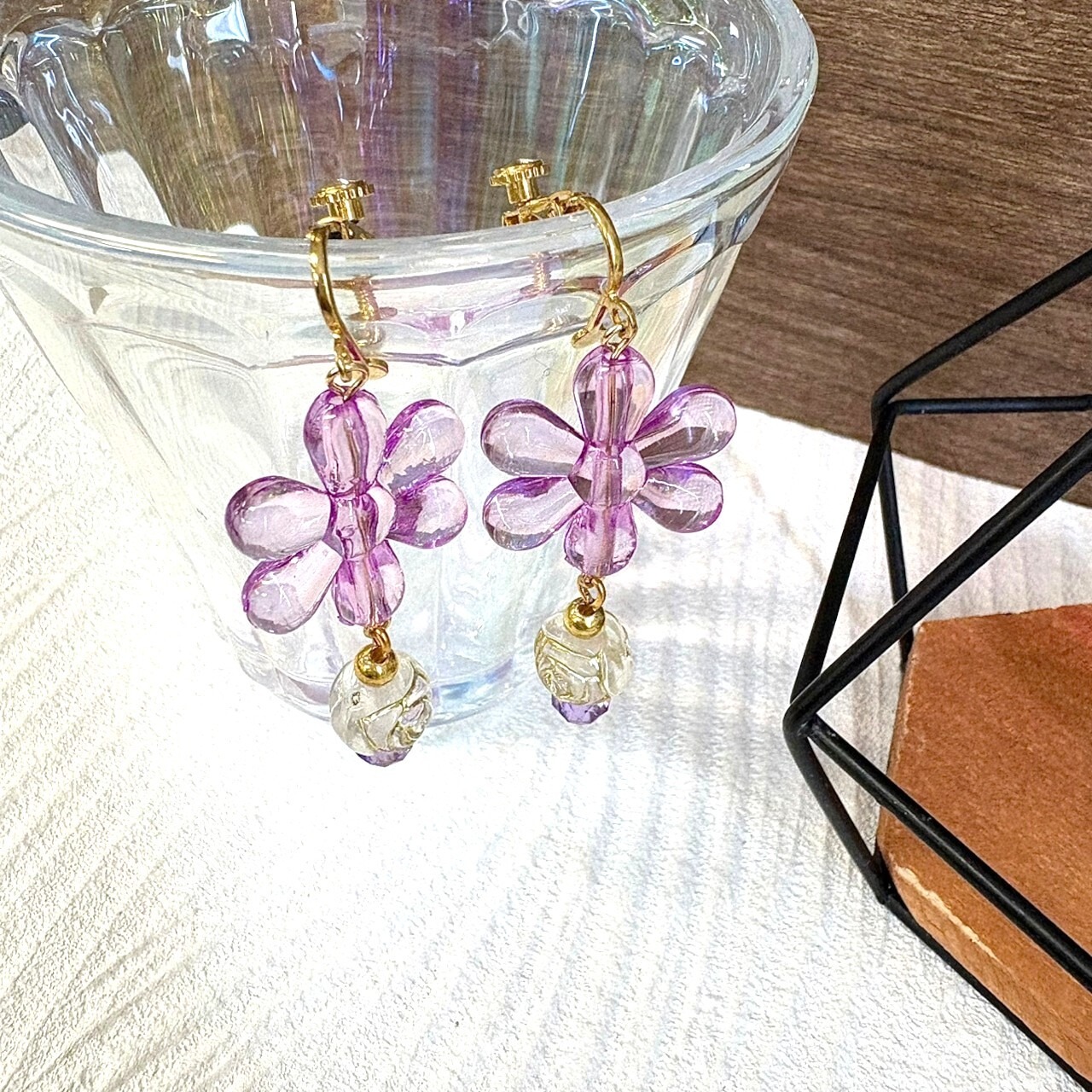 ハンドメイド あいあいわーく 送料無料 イヤリング オリジナル プチギフト プレゼント サージカルステンレス 金アレ対応 金属アレルギー対応 花モチーフ ラベンダー パープルアクセ 透明感アクセサリー ゆれるイヤリング フェミニンコーデ 大人可愛い 淡色コーデ ナチュラルアクセサリー クリアビーズ 上品アクセサリー ゆらゆらアクセ 可憐なアクセサリー イヤリングコーデ 耳元おしゃれ プチプラアクセ ガーリーアクセ 大人女子コーデ フラワーアクセ オールシーズンアクセ