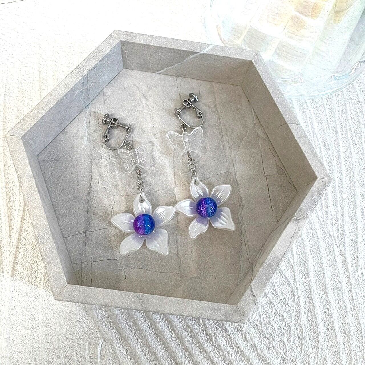 ハンドメイド あいあいわーく 送料無料 イヤリング オリジナル プチギフト プレゼント サージカルステンレス 金アレ対応 金属アレルギー対応 蝶モチーフ 花びらイヤリング グラデーションビーズ 透明感アクセサリー ゆめかわアクセ パープルアクセサリー ブルーアクセサリー 揺れるイヤリング フェミニンアクセ 大人可愛いイヤリング 軽いイヤリング 小ぶりイヤリング オフィスコーデアクセ デートコーデアクセ 特別な日のアクセサリー 耳元コーデ