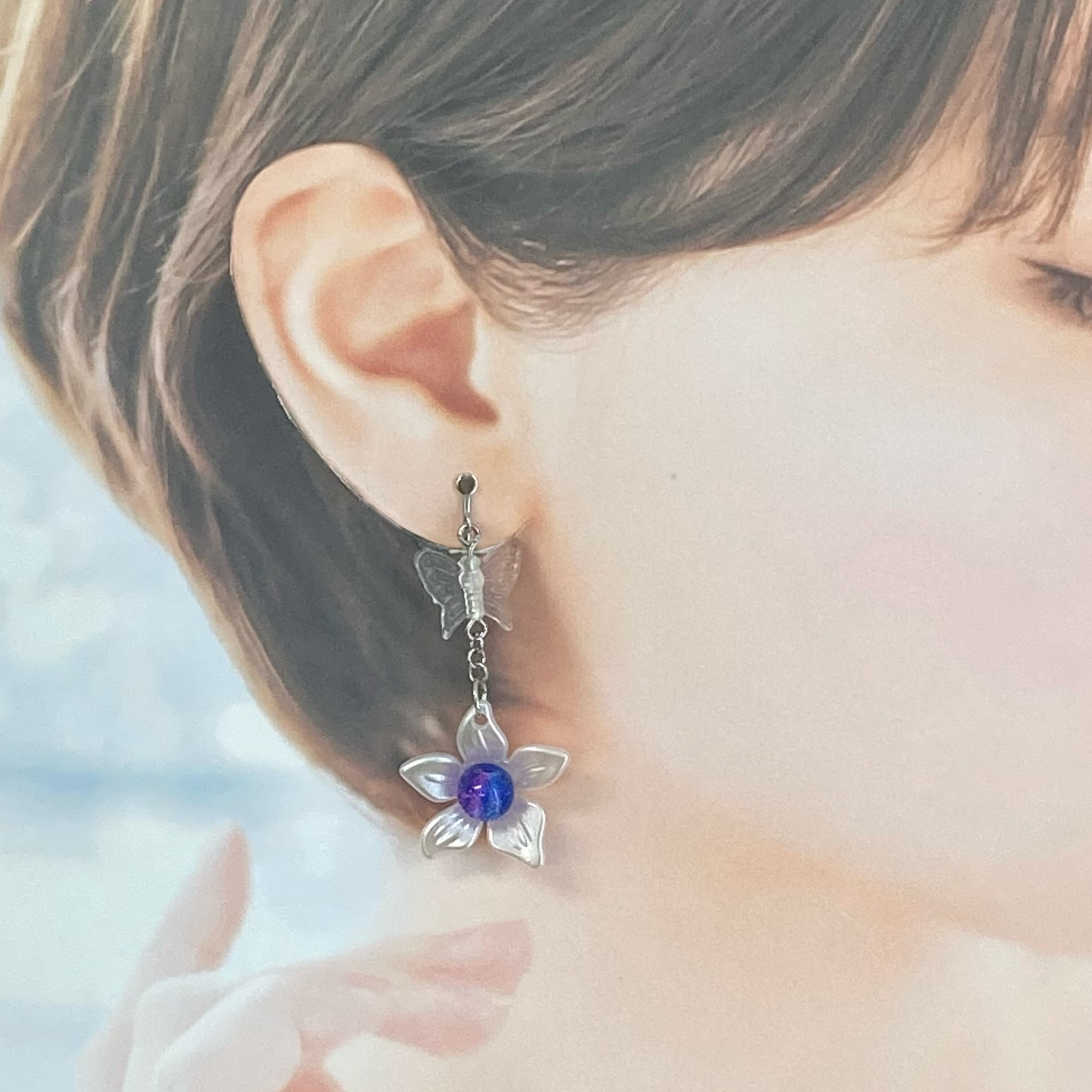 透明感あふれる蝶モチーフから、白く艶めく花びらが優しく揺れるイヤリング。