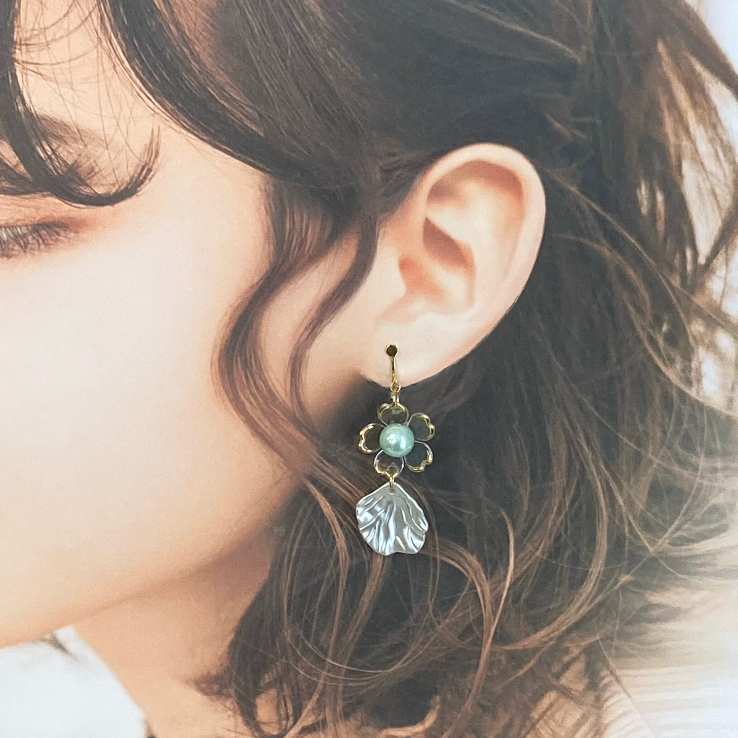 ハンドメイド あいあいわーく 送料無料 イヤリング オリジナル プチギフト プレゼント サージカルステンレス 金アレ対応 金属アレルギー対応 ミントアクセサリー パールアクセサリー フラワーピアス 花モチーフイヤリング 淡色コーデ 大人可愛い 透明感アクセ ゆれるイヤリング パールピアス 上品アクセサリー 大人フェミニン シンプル可愛い 華やかコーデ ギフトにおすすめ 淡色女子 オケージョンアクセ 大人女子コーデ フェミニンコーデ
