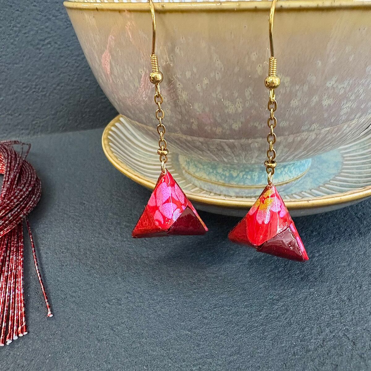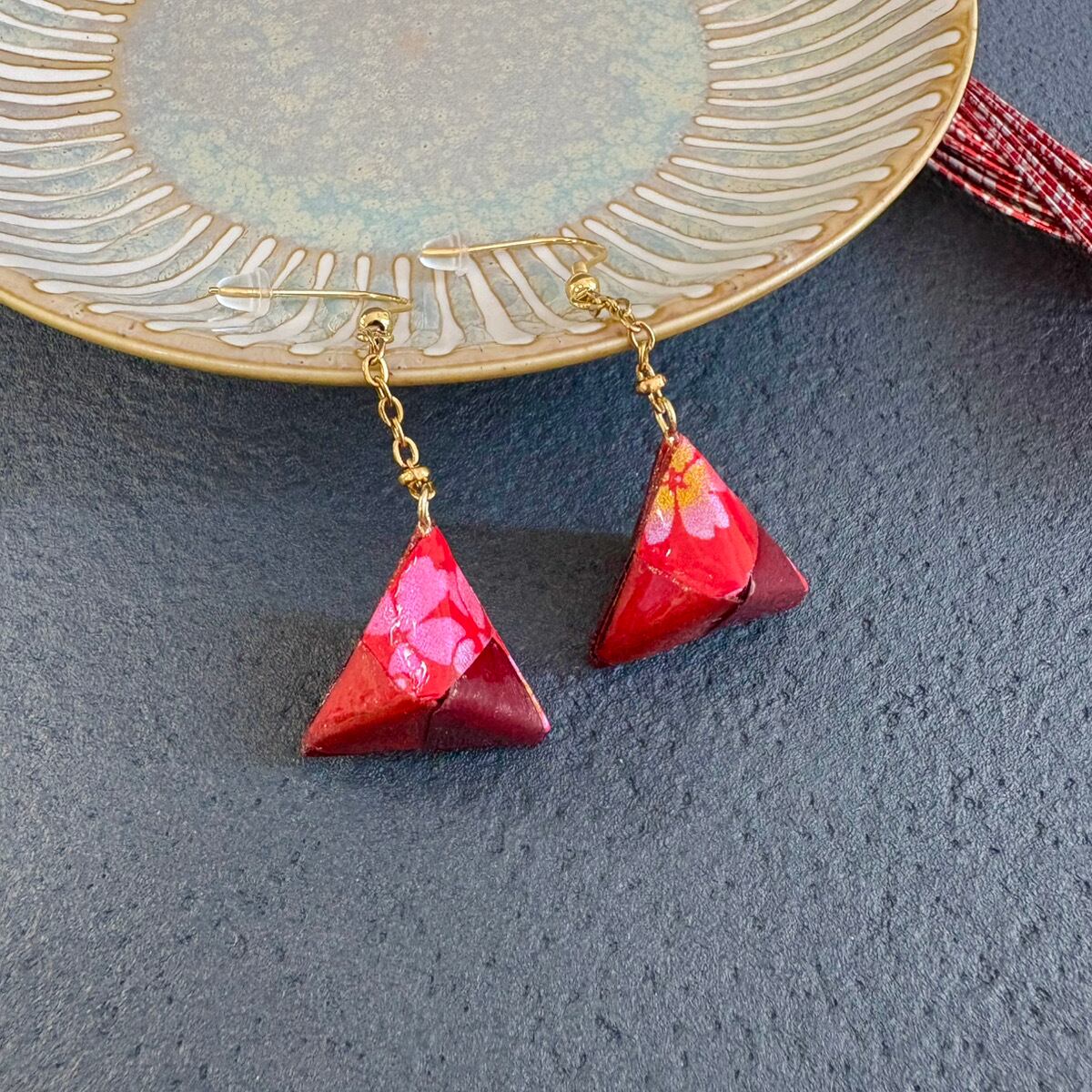 鮮やかな赤の手染め友禅和紙を丁寧に折り上げた、個性あふれるピアス。