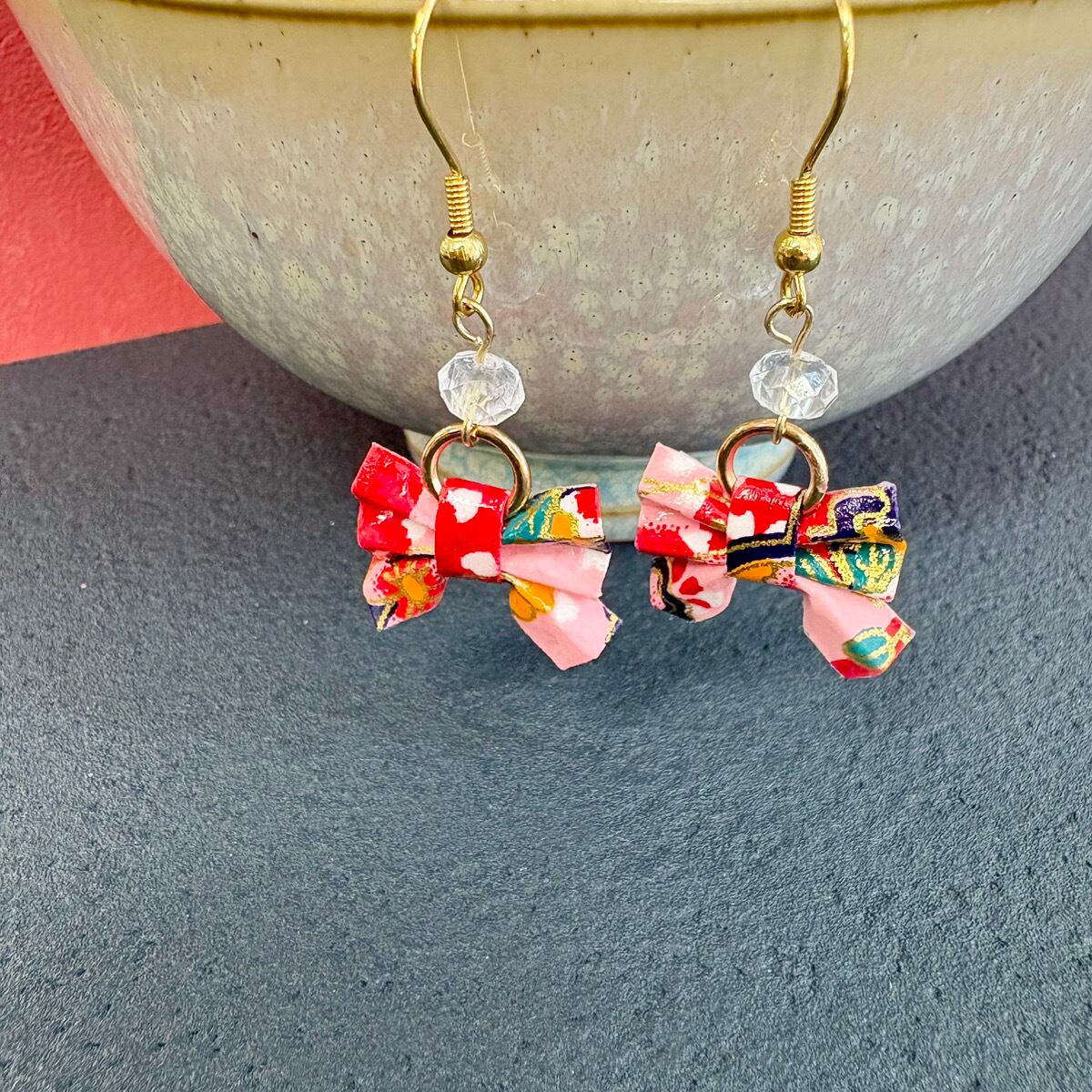 手染めの友禅和紙で丁寧に折り上げた、リボンモチーフのピアス。