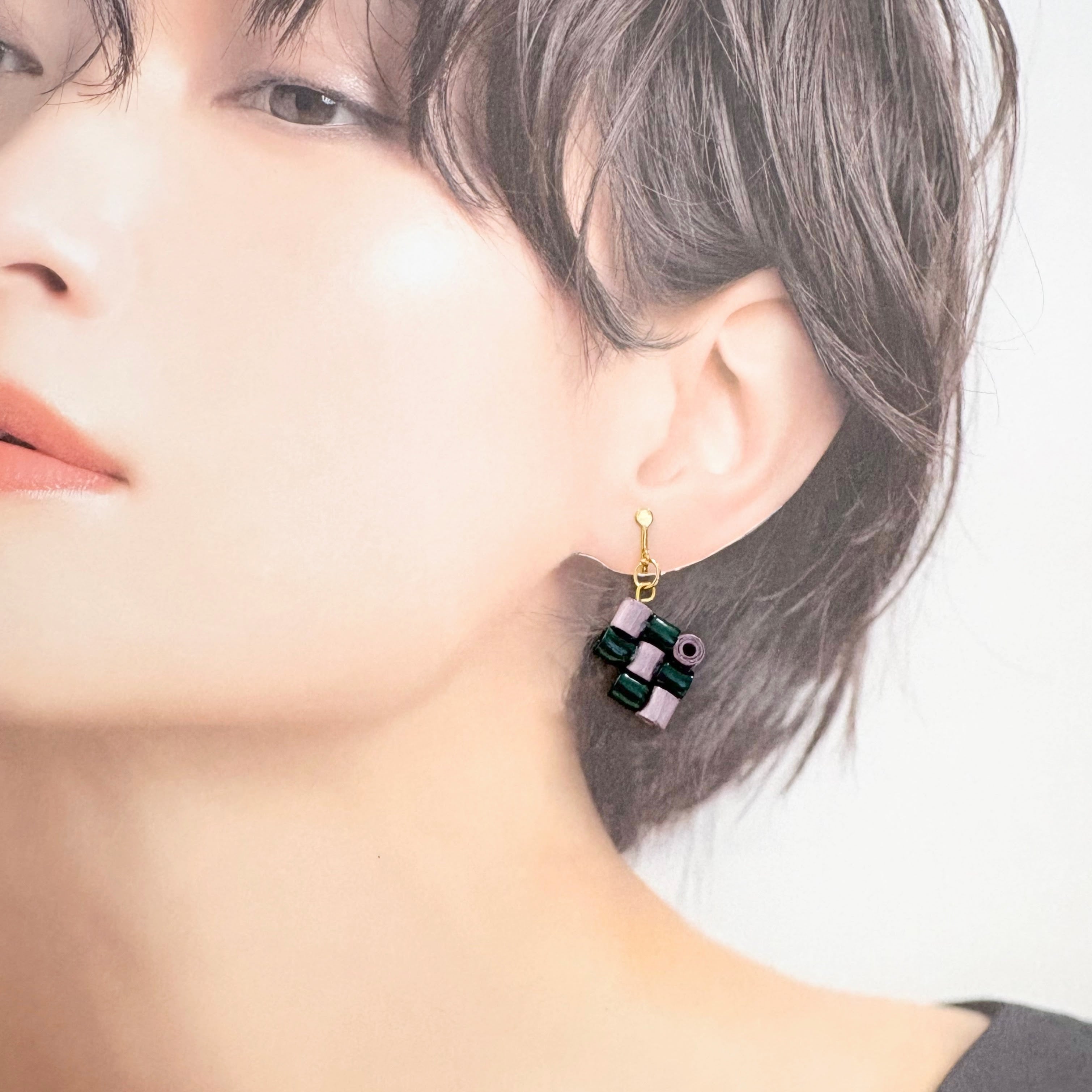 モダニカルチェック|友禅和紙の立体キューブ×くすみカラーイヤリング