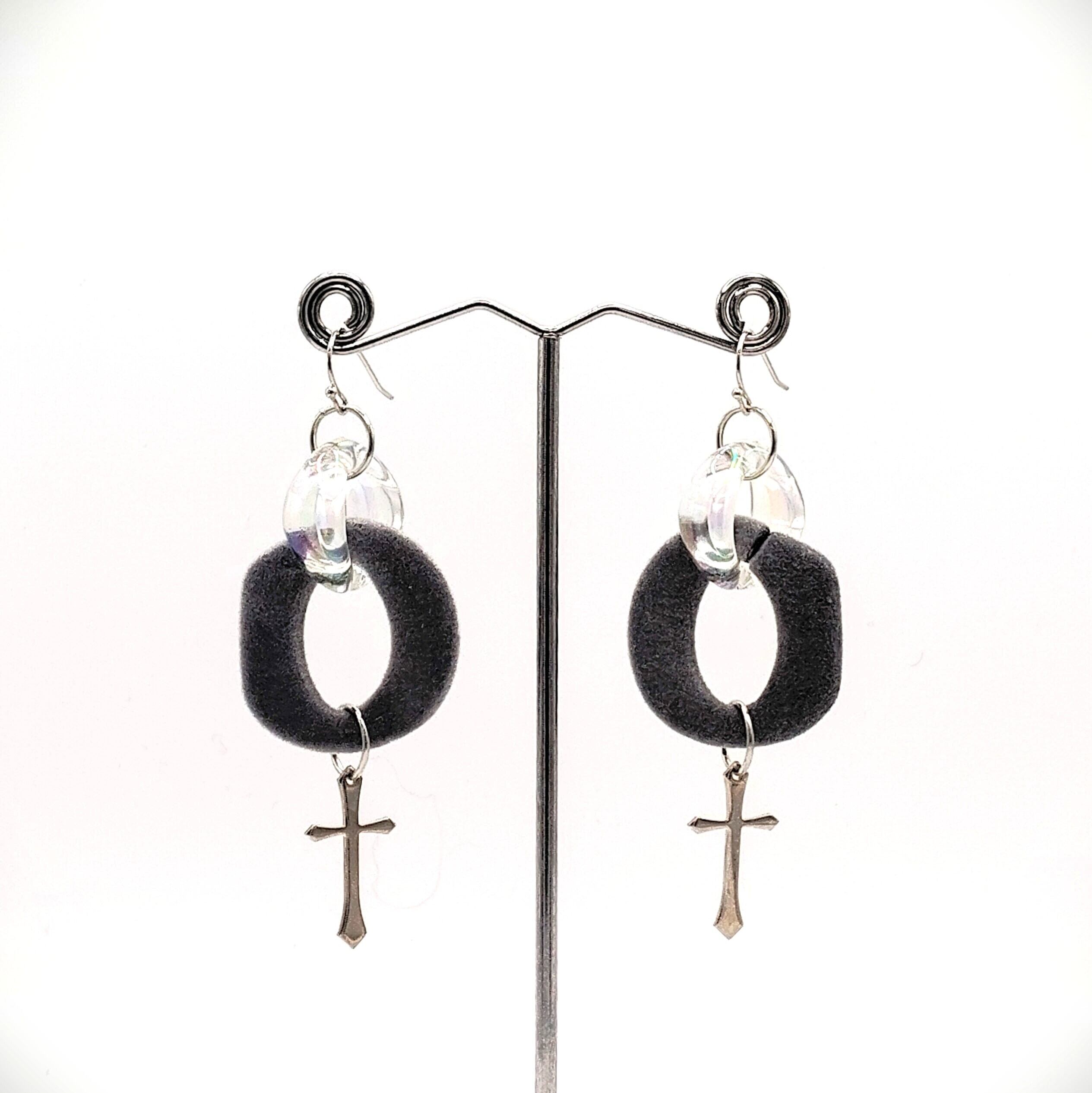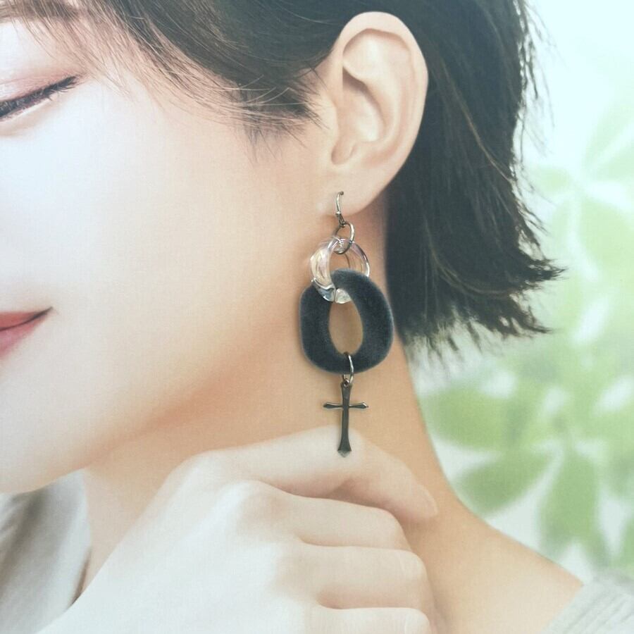 ふんわりとした質感のグレーベロアに、光を受けて輝くクリアリング、そしてクロスチャームを組み合わせた一点ものピアス。