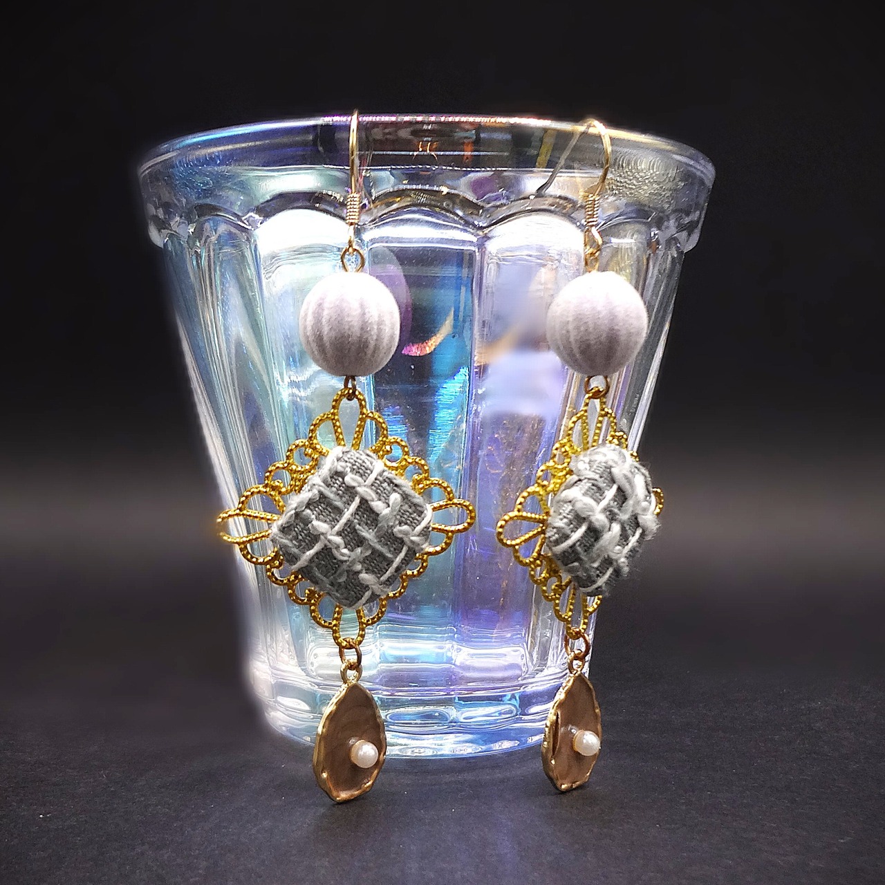 ✨ツイードモチーフ:ゴールドの透かしパーツの中に、繊細な手刺繍風ツイード柄を閉じ込めました。カジュアルになりすぎない上品なモチーフが、クラシカルな雰囲気を醸し出します。