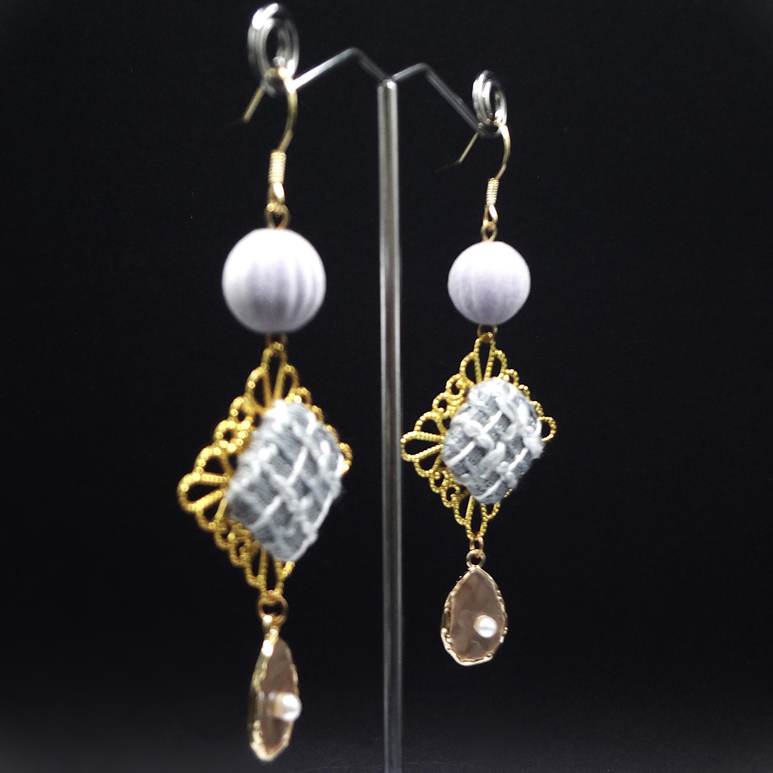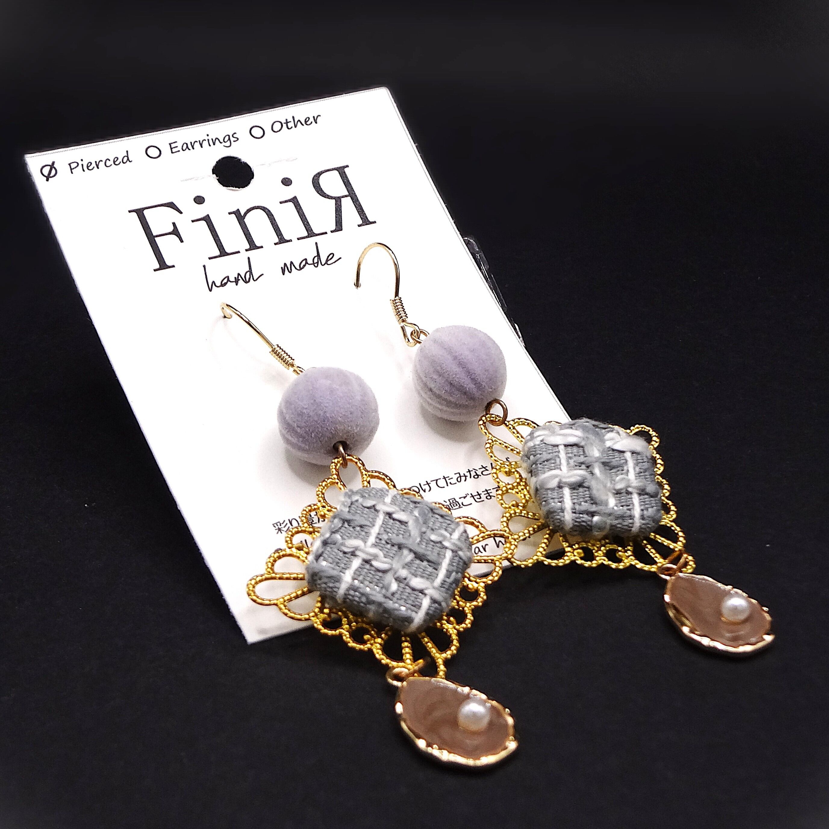淡いラベンダーグレーのベロアボールに、手刺繍風ツイードモチーフとパールを組み合わせた、他にはない一点もののピアスです。