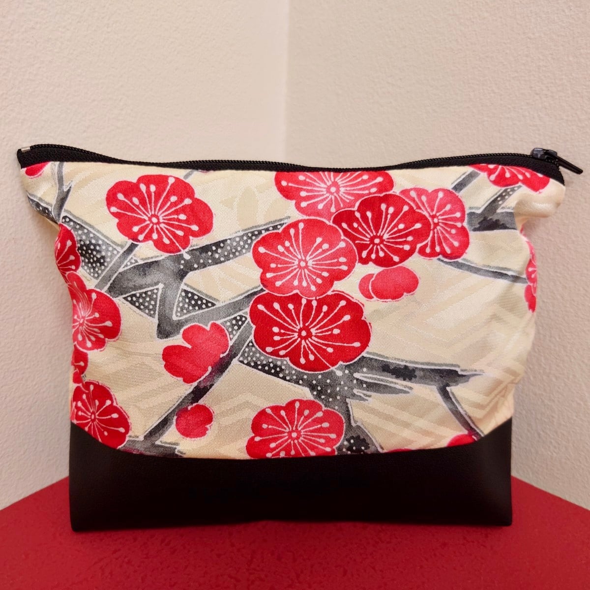 華やかな赤い梅の花が咲き誇る和柄生地に、レザー調のブラックを組み合わせた上質な和モダンポーチです。