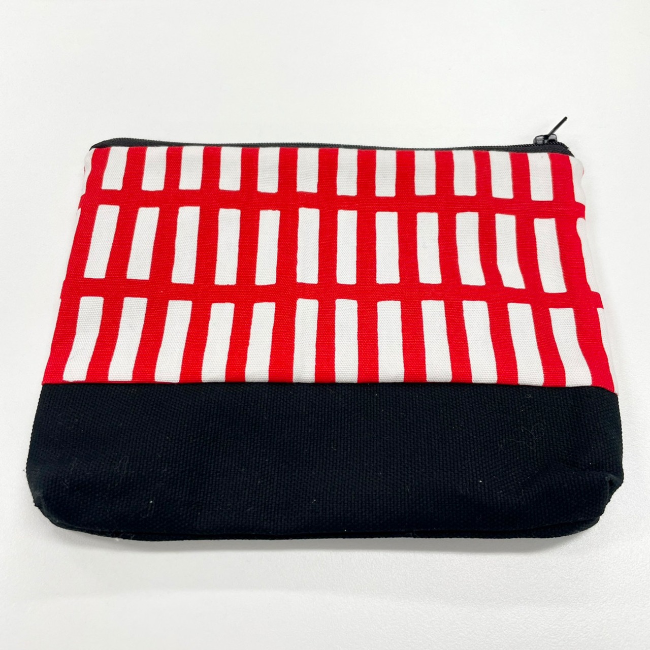 大胆な赤×白の幾何学模様を使用した、目を惹くデザインのハンドメイドポーチ。