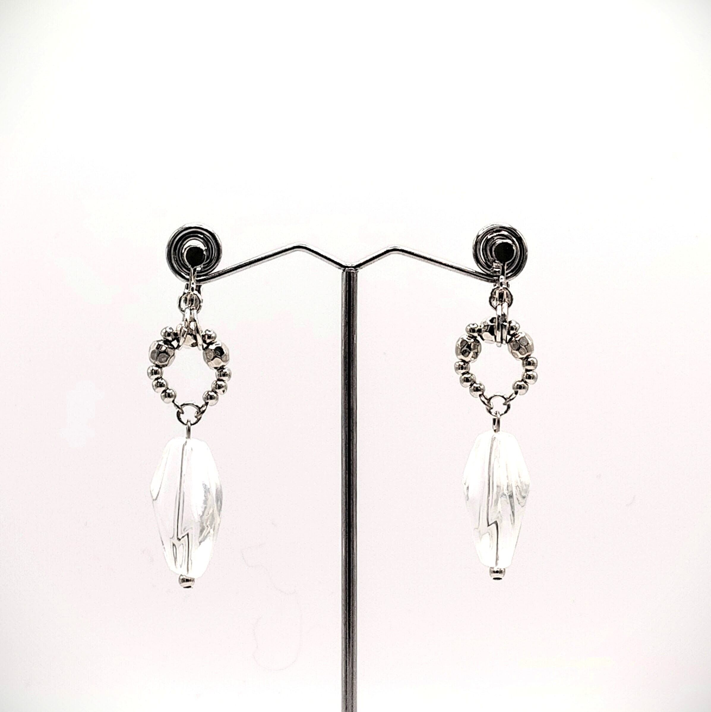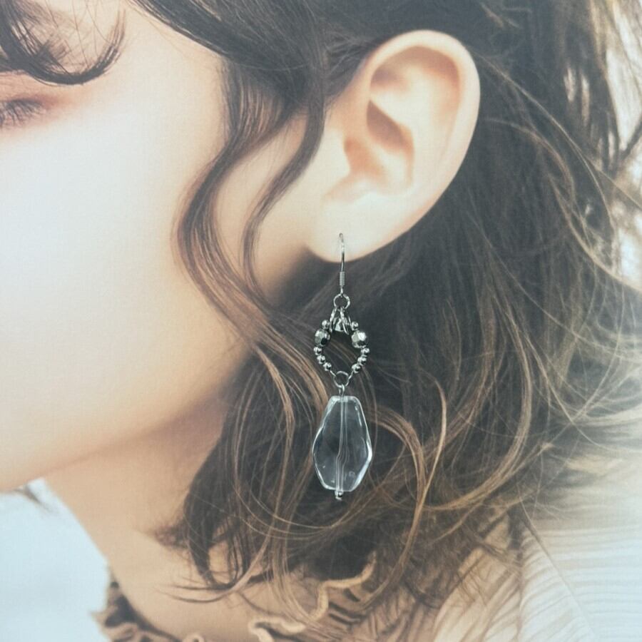 透きとおるクリアビーズに艶やかなシルバーパーツを合わせた、涼やかで上品な一点ものピアス。
