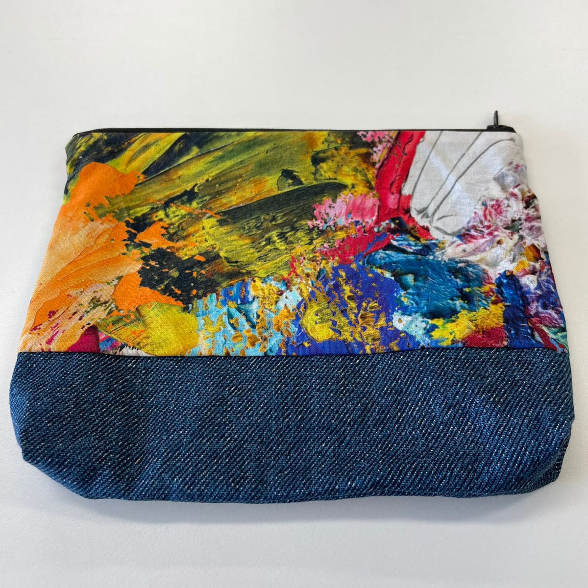 鮮やかなペイントアート生地と深みのあるインディゴデニムを組み合わせた、世界にひとつの一点ものポーチ。
