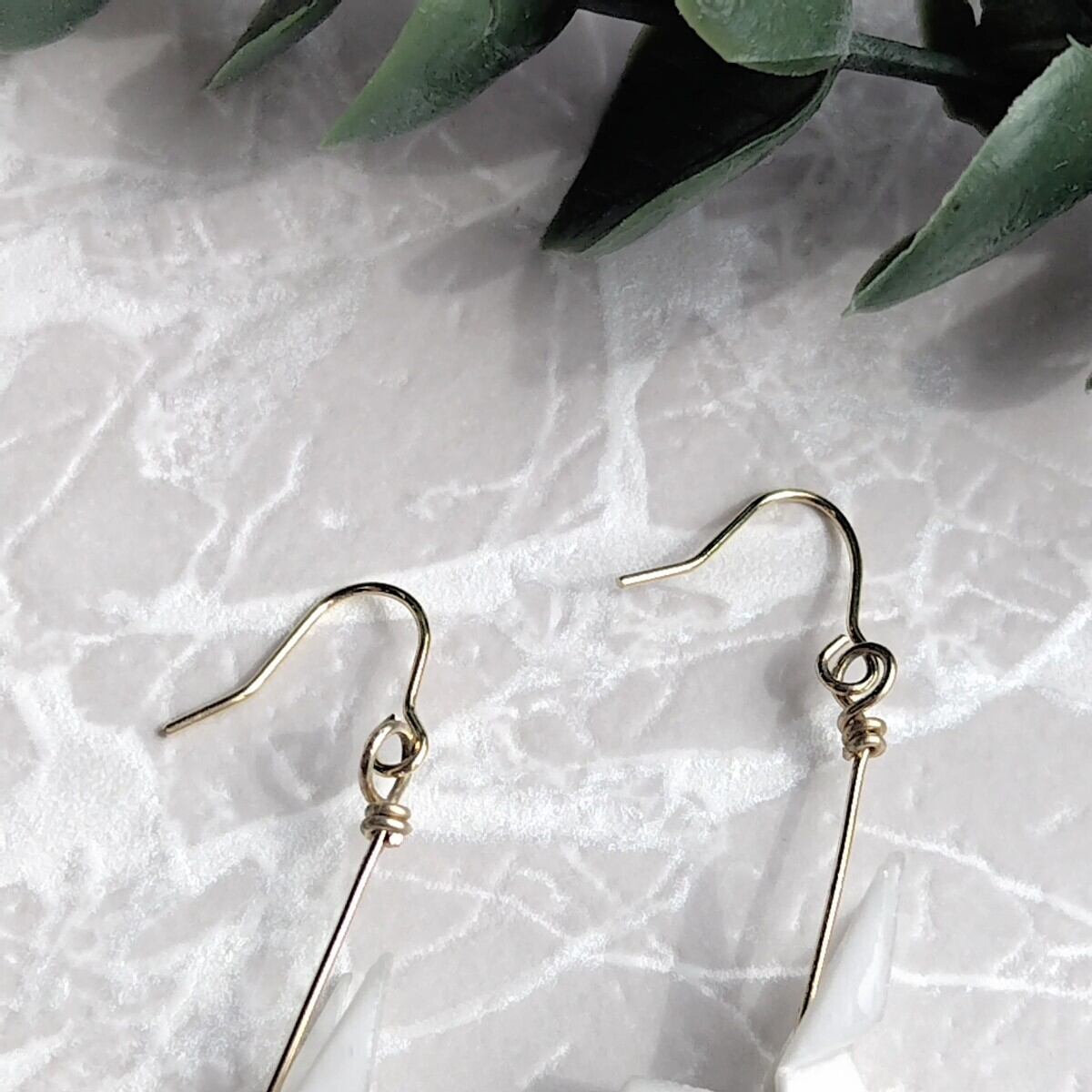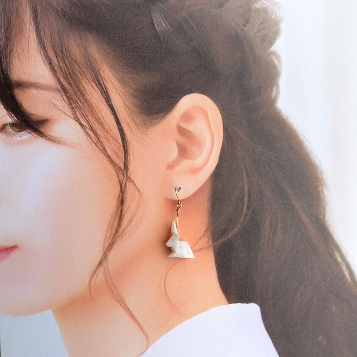一枚の白い折り紙から丁寧に折り上げ、レジンで艶を閉じ込めた、上品な白うさぎのピアス。