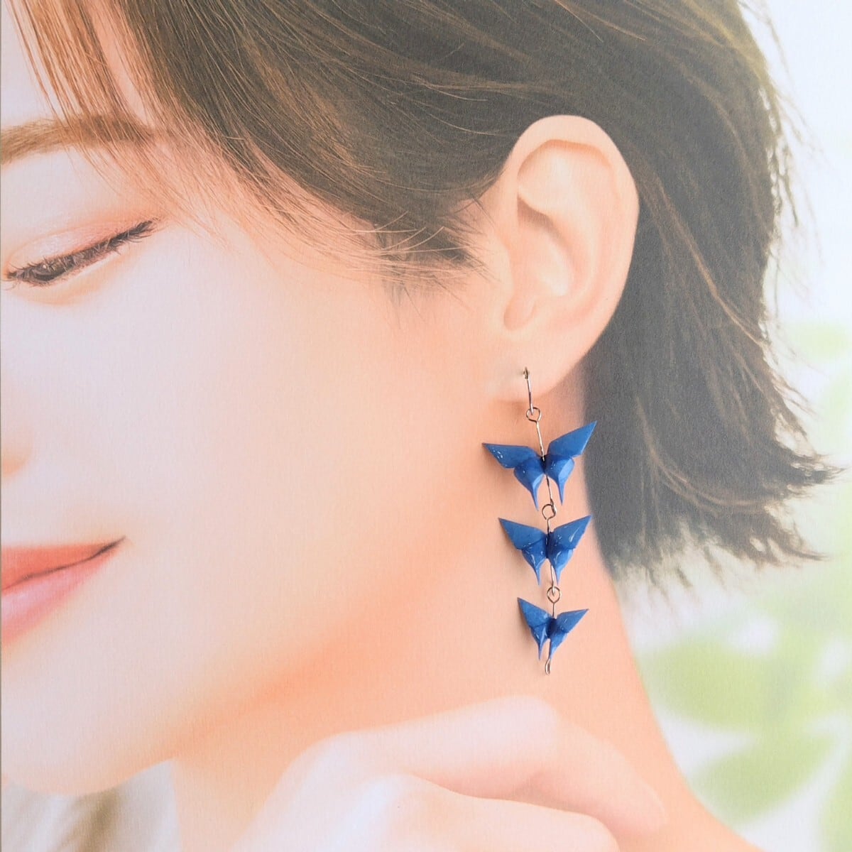 群青色の折り紙を一羽ずつ丁寧に折り上げ、レジンで光を閉じ込めた繊細な蝶のロングピアス。