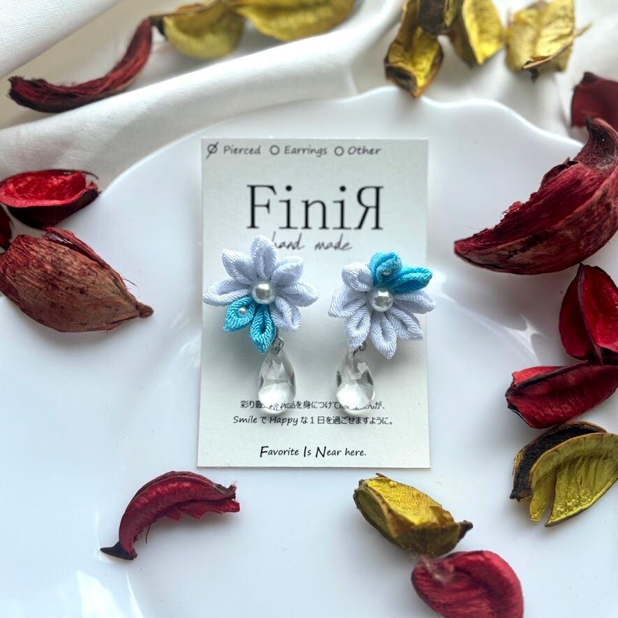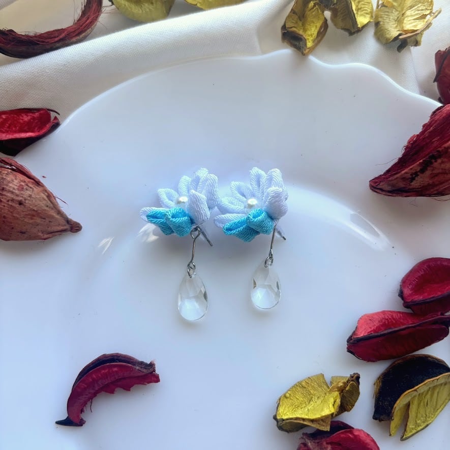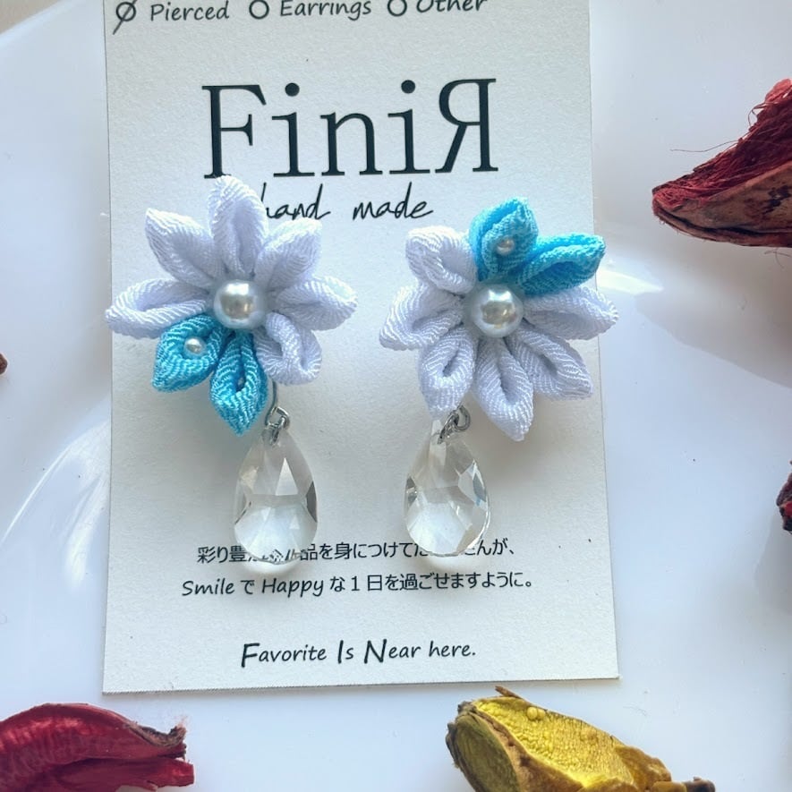 ハンドメイド あいあいわーく 送料無料 ピアス イヤリング オリジナル つまみ細工 tsumamizaiku 白 和 洋 揺れる 可愛い 特別な日 結晶 冬 水色 雪 ブルー 花 フラワー 2way 2wayピアス ワンポイント 浴衣 着物 プレゼント シンプル