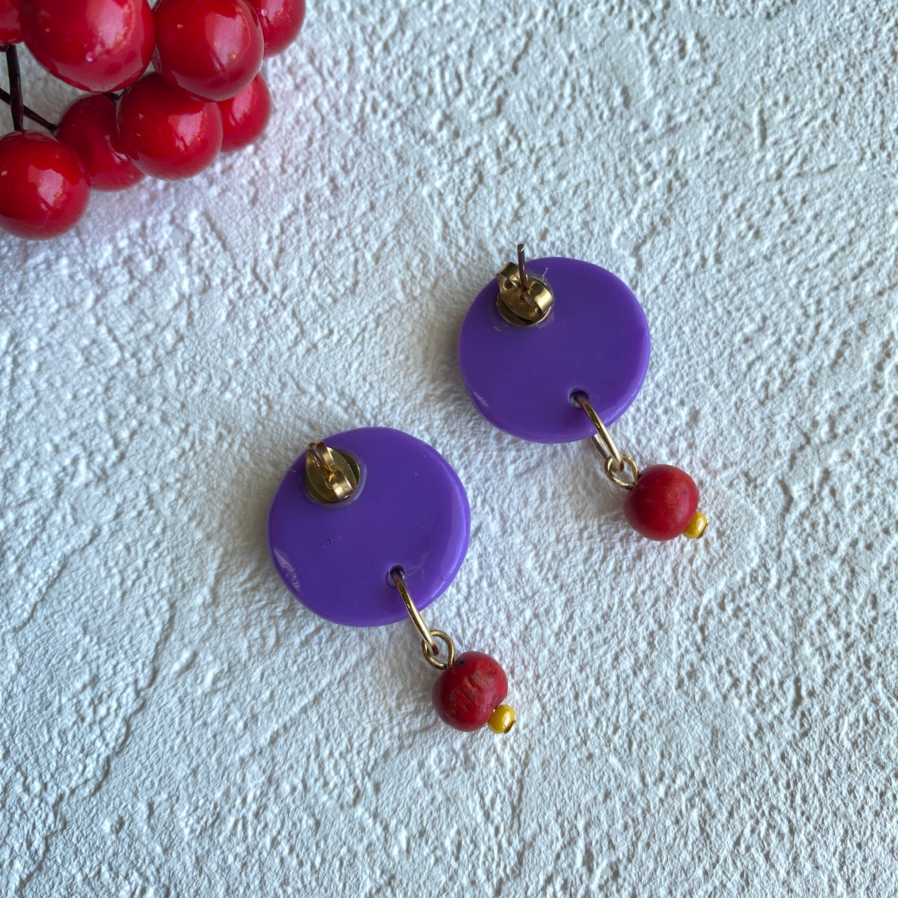 伝統模様・釘抜柄に、江戸紫と赤いウッドビーズを合わせた、彩り豊かな一点ものピアス。