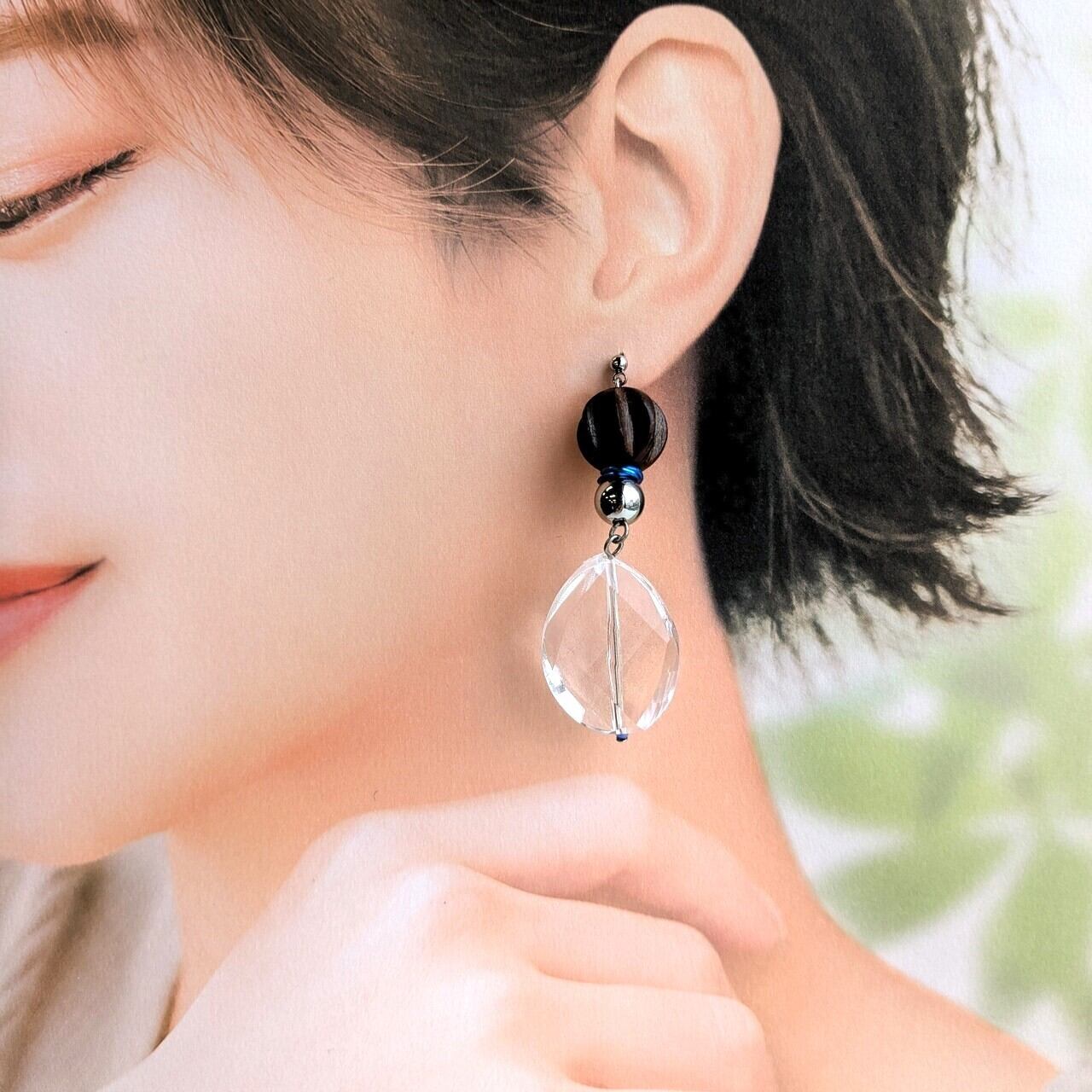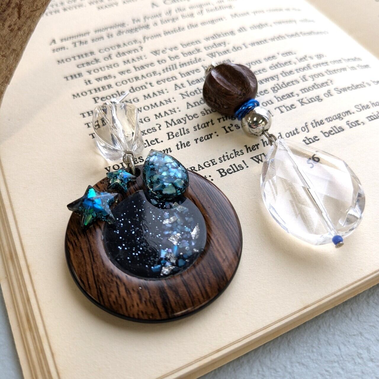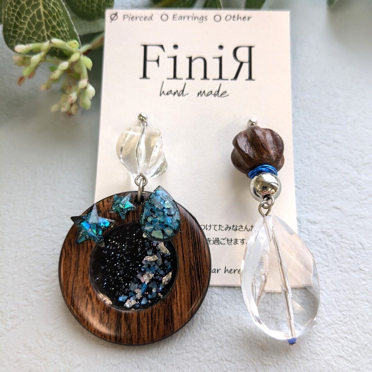 星屑と木のしずくピアス|木目×クリアが奏でるアシンメトリーな輝き