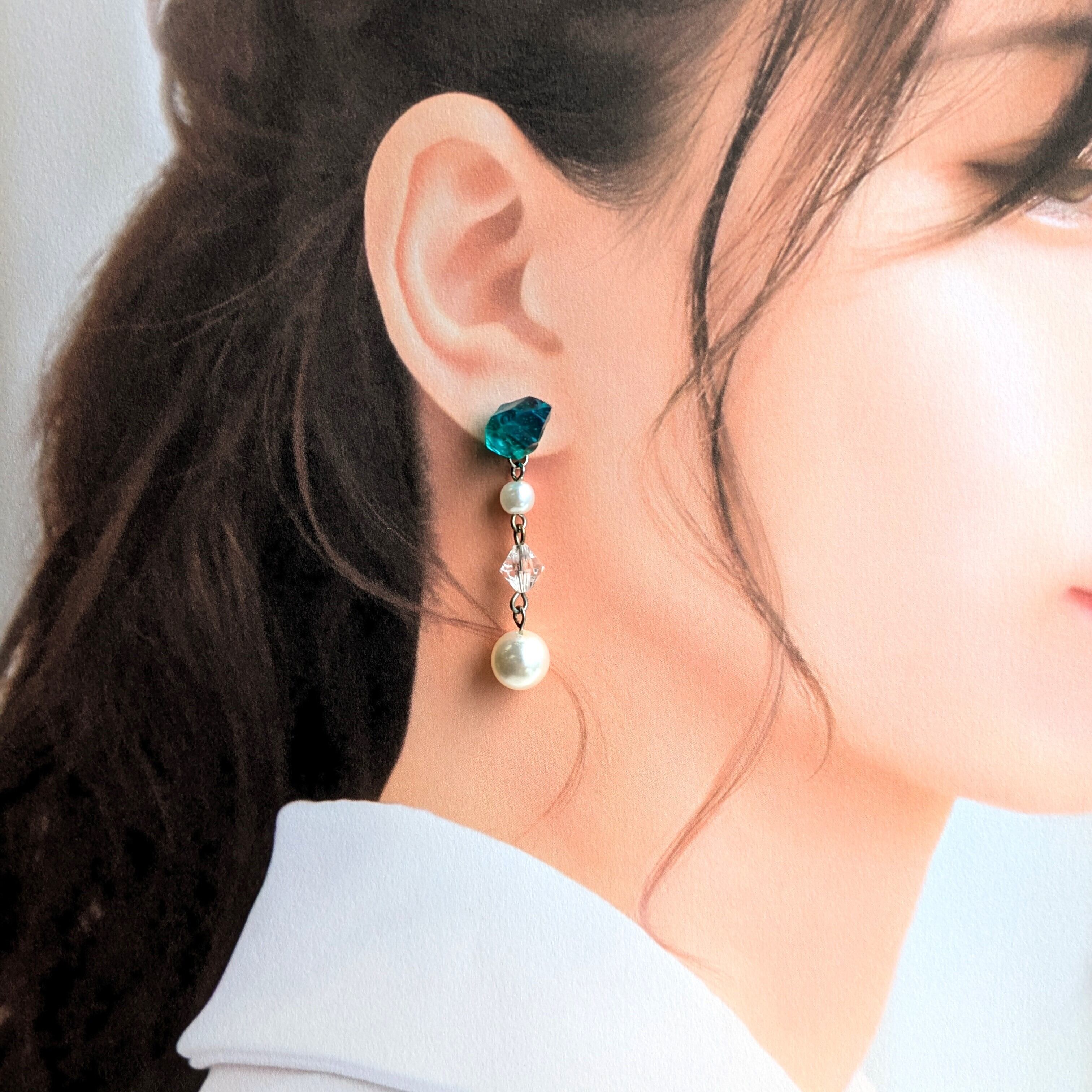 アイスミントの雫ピアス|透きとおるレジンとパールの2wayアクセサリー